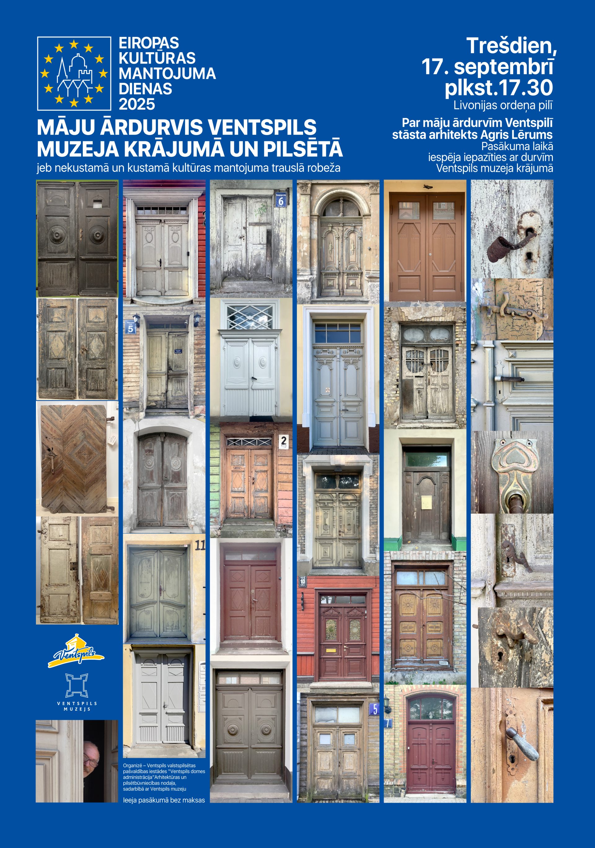 Ventspils pilsētā ir saglabājušās tuvu pie diviem simtiem vēsturisko ārdurvju. Par durvīm muzejā, Vecpilsētā, Ostgalā, Jaunpilsētā, Vasarnīcu rajonā, vēsturiskajos Pārventas un pilsētas Dienviddaļas ciemos stāstīs Agris Lērums, arhitekts ar ilggadīgu pieredzi mūsu pilsētas vēsturisko ēku izpētē un atjaunošanā. Pasākuma laikā Ventspils muzejs sola interesentiem retu iespēju ielūkoties muzeja krājuma glabātuvē, kur pamatfondā tiek glabāti 20.gs. otrajā pusē demontētu vēsturisko pilsētas ēku dažādi būvgaldniecības izstrādājumi, tostarp arī četru nojaukto Vecpilsētas ēku ārdurvis, divu pārbūvētu ēku autentiskās ārdurvis un vienas durvis no 20.gs. sākumā veiktiem arheoloģiskajiem izrakumiem.