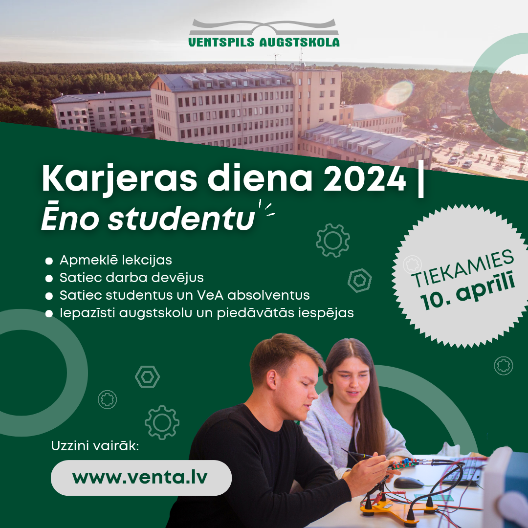 10. aprīlī Ventspils Augstskolā norisināsies Karjeras diena 2024, kas gan esošajiem, gan topošajiem studentiem sniegs iespēju satikt uzņēmējus, klausīties veiksmes stāstos, iedvesmoties studēt VeA un būt klāt desmitās Andra Klausa stipendijas pasniegšanā.