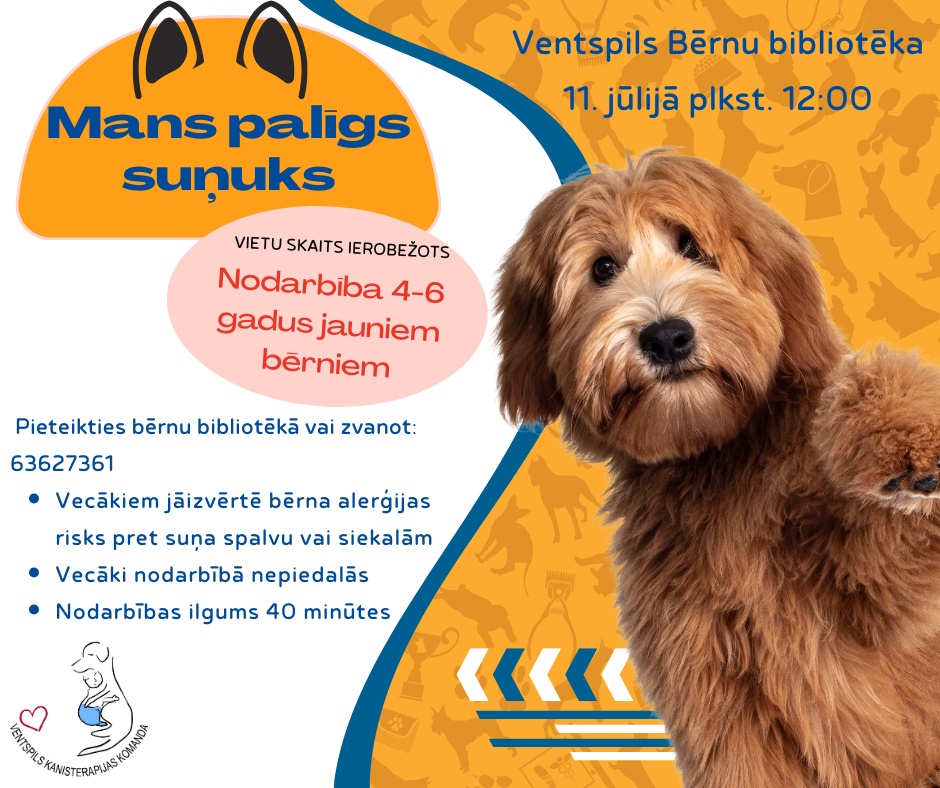 Piektdien, 11. jūlijā, 12.00 Bērnu bibliotēka aicina uz nodarbību ar Ventspils kanisterapijas suņiem 4 – 6 gadus veciem bērniem “Mans palīgs suņuks”. Nodarbības ilgums – 40 minūtes.
