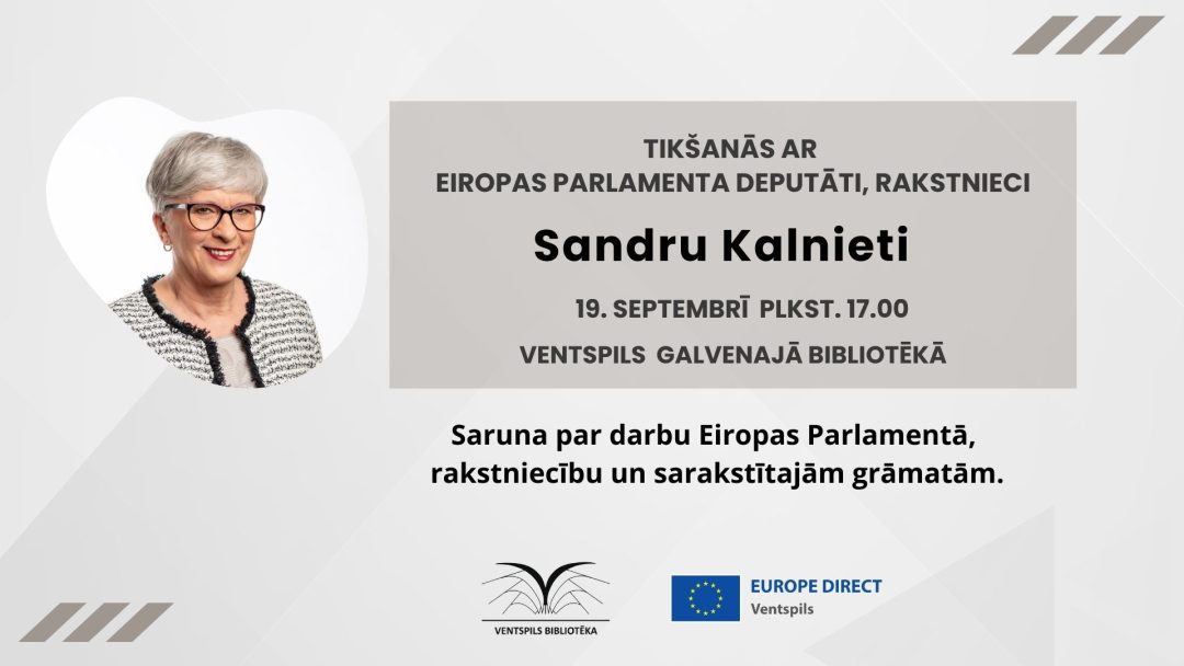 Piektdien, 19. septembrī, plkst. 17.00 Ventspils Galvenajā bibliotēkā viesosies Eiropas Parlamenta deputāte, mākslas zinātniece, rakstniece Sandra Kalniete. Viņa ir vienīgā no Atmodas laika politiķēm, kura vēl joprojām ir aktīvajā politikā un turpina strādāt Latvijas labā.