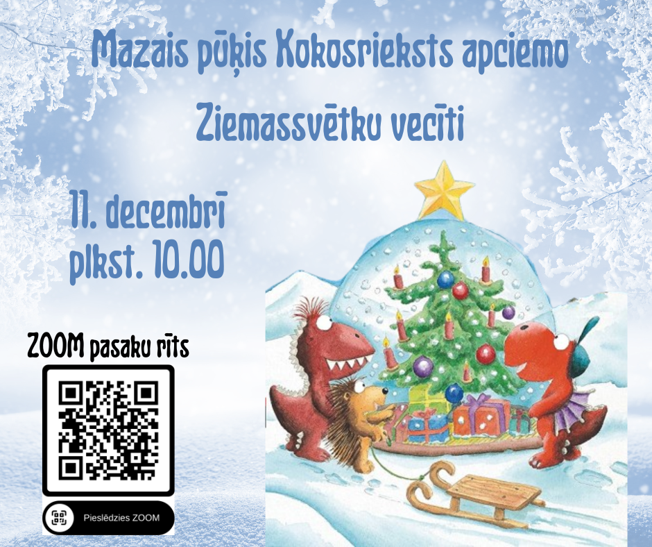 ZOOM Pasaku rīts. Fragmentus no grāmatas “Mazais pūķis Kokosrieksts apciemo Ziemassvētku vecīti” lasa bibliotekāre Alise.