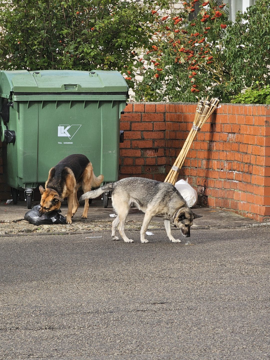 Jau otro reizi sastopam divus paliela auguma klaiņojošus suņus. Trešdienas pēcpusdienā skraidīja Bērzu ielas apkārtnē, kur daudz bērnu no skolas, arī bērnu dārzs turpat. Vasarā šie paši suņi brīvi klīda pa Katoļu ielu. Toreiz tika ziņots arī pašvaldības policijai, gaidījām ilgi, bet nesagaidijām. Varbūt kāds zina, kas tie par suņiem, kur dzīvo, kam pieder? Saimniekiem derētu uzlikt sodu par mājdzīvnieku nepieskatīšanu.