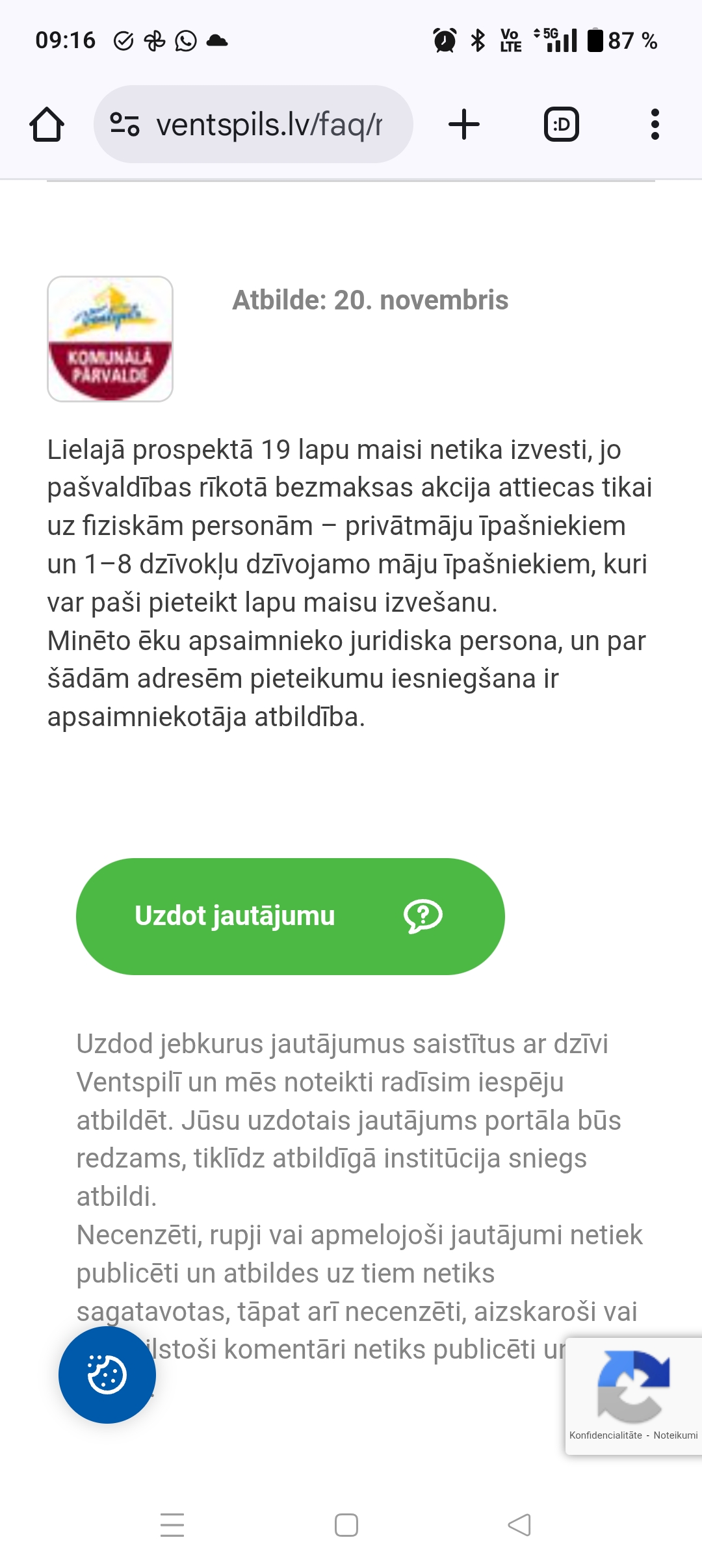 Uzdod jebkurus jautājumus saistītus ar dzīvi Ventspilī un mēs noteikti radīsim iespēju atbildēt. Jūsu uzdotais jautājums portāla būs redzams, tiklīdz atbildīgā institūcija sniegs atbildi.