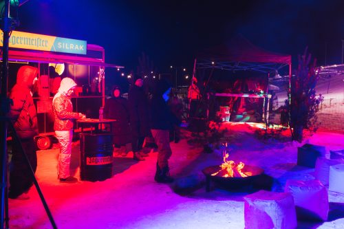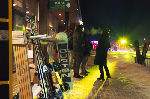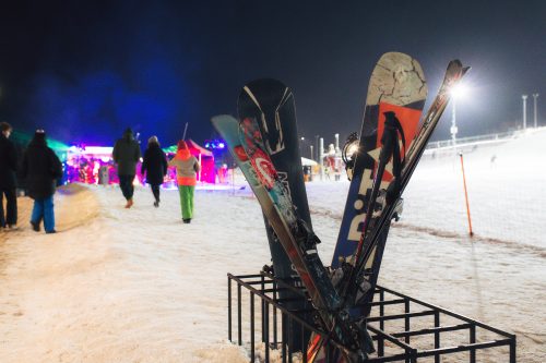 Slēpošanas kalns un pilsēta ziemas naktī