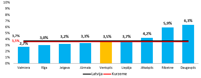 Ventspils pilsētā 2026. gada 27. aprīlī bezdarba līmenis, rēķinot pret iedzīvotāju skaitu darbspējas vecumā 2025. gada sākumā – 3,5 % – ir vienā līmenī ar bezdarba līmeni Kurzemē (3,5%) un par 0,2 procentpunktiem zemāks nekā Latvijā (3,7%) sk. 1. attēlu.