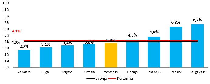 Ventspils pilsētā 2026. gada 16. martā bezdarba līmenis, rēķinot pret iedzīvotāju skaitu darbspējas vecumā 2025. gada sākumā – 3,8 % – ir par 0,3 procentpunktiem zemāks nekā līmenis Kurzemē (4,1%) un par 0,2 procentpunktiem zemāks nekā bezdarba līmenis Latvijā (4,0%) sk. 1. attēlu.