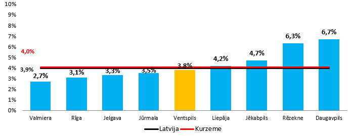 Ventspils pilsētā 2026. gada 23. martā bezdarba līmenis, rēķinot pret iedzīvotāju skaitu darbspējas vecumā 2025. gada sākumā – 3,8 % – ir par 0,2 procentpunktiem zemāks nekā līmenis Kurzemē (4,0%) un par 0,1 procentpunktiem zemāks nekā bezdarba līmenis Latvijā (3,9%) sk. 1. attēlu.