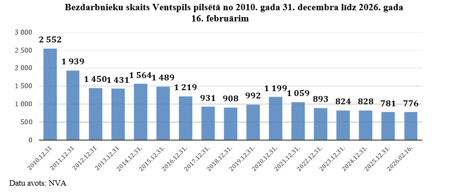 Saskaņā ar Nodarbinātības valsts aģentūras (NVA) datiem reģistrētais bezdarbnieku skaits Ventspils pilsētā 2026. gada 16. februārī, salīdzinot ar 2026. gada 9. februāri ir samazinājies par 2 bezdarbniekiem – 776 cilvēki.