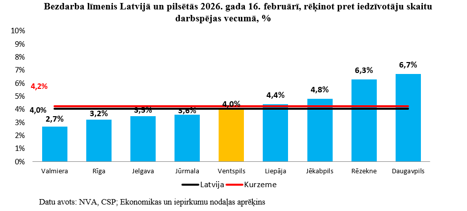 Ventspils pilsētā 2026. gada 16. februārī bezdarba līmenis, rēķinot pret iedzīvotāju skaitu darbspējas vecumā 2025. gada sākumā – 4,0 % – ir par 0,2 procentpunktiem zemāks nekā līmenis Kurzemē (4,2%), bet vienā līmenī ar bezdarbu Latvijā kopumā (4,0%) sk. 1. attēlu.