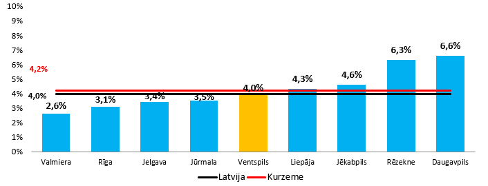 Ventspils pilsētā 2026. gada 19. janvārī bezdarba līmenis, rēķinot pret iedzīvotāju skaitu darbspējas vecumā 2025. gada sākumā – 4,0 % – ir par 0,2 procentpunktiem zemāks nekā līmenis Kurzemē (4,2%), bet vienā līmenī ar bezdarbu Latvijā kopumā (4,0%) sk. 1. attēlu.