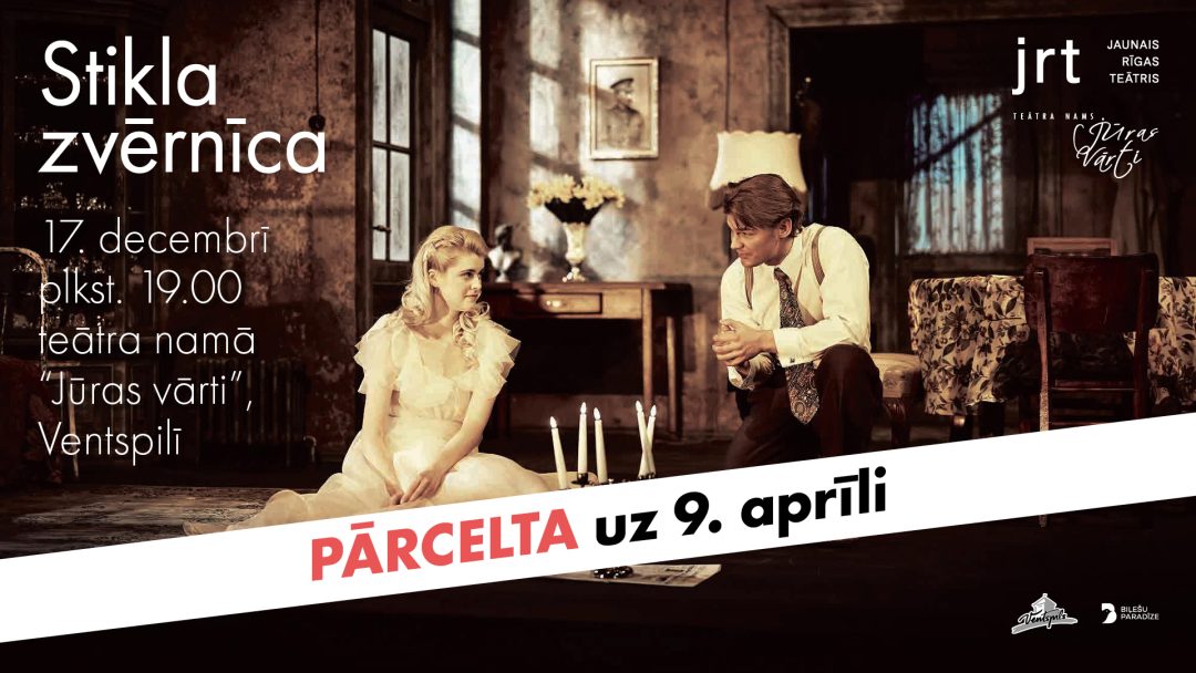 Aktrises slimības dēļ uz 2026. gada 9. aprīlī pārcelta šovakar teātra namā “Jūras vārti” paredzētā Jaunā Rīgas Teātra viesizrāde “Stikla zvērnīca”. Visas iegādātās biļetes un abonementi derīgi.