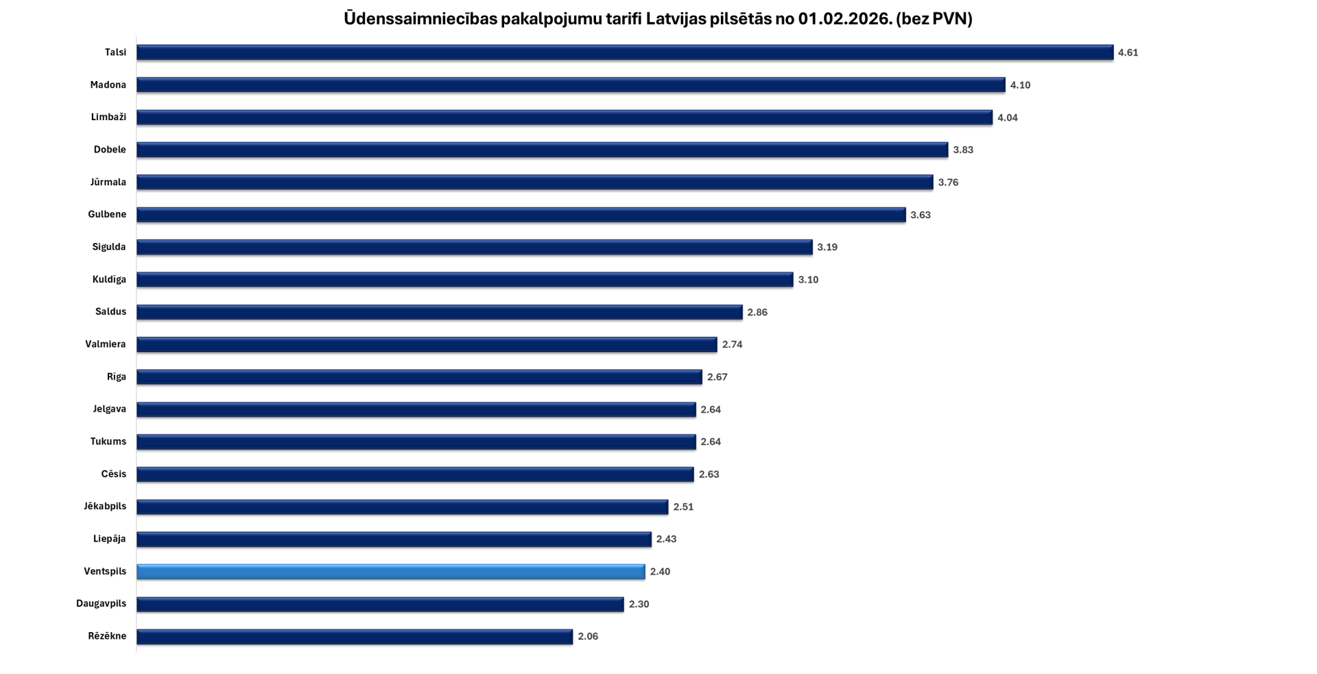 Neskatoties uz izmaiņām tarifos, arī turpmāk Ventspils ūdenssaimniecības pakalpojumu tarifi saglabāsies vieni no zemākajiem Latvijā. Ņemot vērā Sabiedrisko pakalpojumu regulēšanas komisijas interneta vietnē pieejamo informāciju par apstiprinātajiem ūdenssaimniecības pakalpojumu tarifiem 2026. gadam, pēc jauno tarifu stāšanās spēkā zemāki tarifi būs tikai Daugavpilī un Rēzeknē.