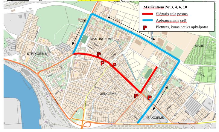 Maršrutu autobusi Nr.6 un Nr.10 virzienā uz pilsētu neapkalpos pieturas “Embūtes iela” (iespējams izmantot pieturas Celtnieku ielā un “Pārventas tirgus”) un “Rindas iela” ( pasažierus uzņems un izlaidīs pieturā “Siguldas iela”).