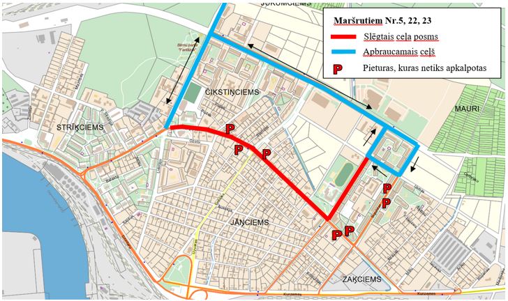 Maršruti Nr.5, 22, 23 slēgto ielas posmu apbrauks pa Talsu ielu, Celtnieku ielu, Siguldas ielu, Usmas ielu un pēc tam atpakaļ pa Celtnieku un Talsu ielu. Netiks apkalpotas pieturas “Siguldas iela”, “Siguldas iela pie Tārgales ielas”, “Tārgales iela”.