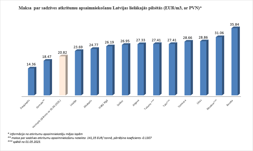 Neskatoties uz plānotajām izmaiņām, maksa par nešķirotu sadzīves atkritumu apsaimniekošanu, salīdzinot ar maksu citās Latvijas pilsētās, Ventspilī saglabāsies viena no zemākajām.