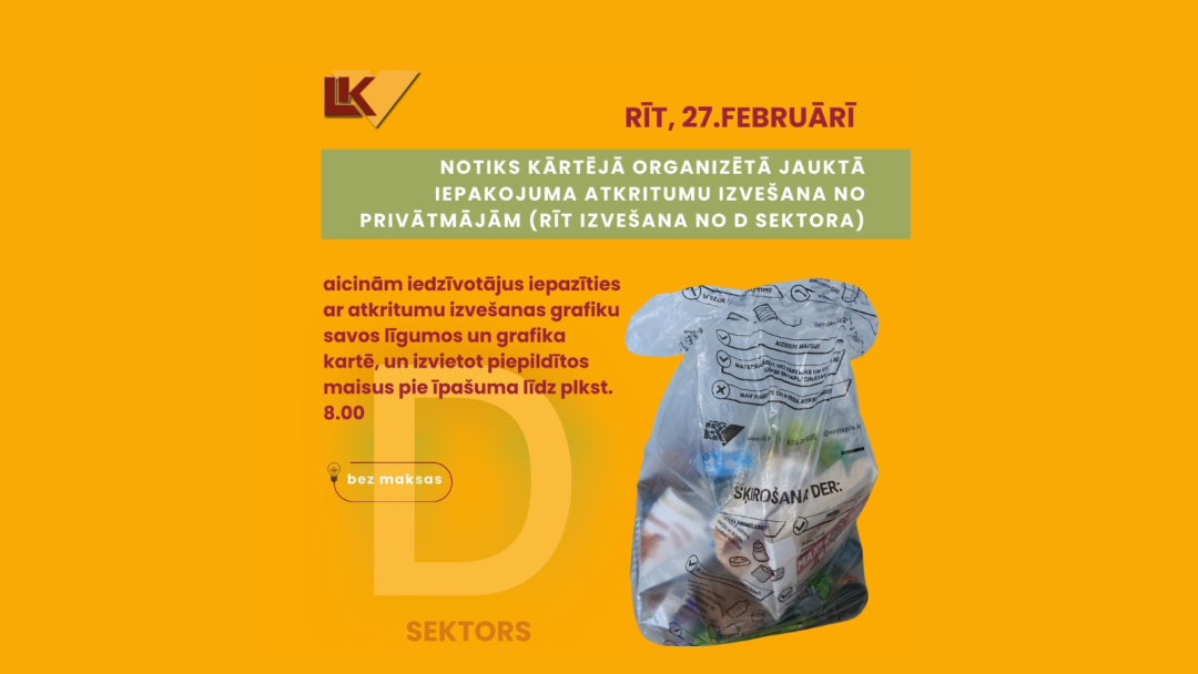 Pašvaldības SIA “Ventspils labiekārtošanas kombināts” informē, ka rīt, 27.februārī notiks jau ceturtā jauktā iepakojuma atkritumu maisu organizētā izvešana no privātmājām. Privātmāju iedzīvotāji aicināti iepazīties ar savu atkritumu izvešanas grafiku noslēgtajos līgumos un savlaicīgi novietot piepildītos atkritumu maisus pie īpašuma. Šajā piektdienā saskaņā ar izvešanas grafika karti maisi tiks izvesti no īpašumiem, kas atrodas D sektorā.