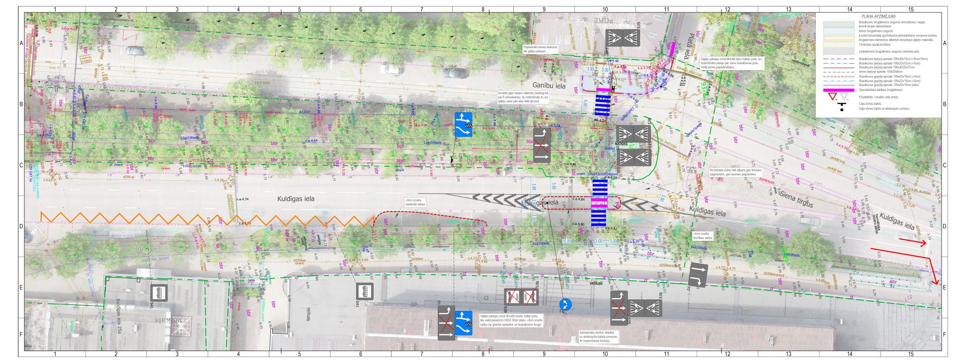 Ņemot vērā to, un lai uzlabotu vismazāk aizsargāto satiksmes dalībnieku (gājēji un velobraucēji) drošību, Kuldīgas un Ganību ielās pie krustojuma ar Plato ielu paredzēts veikt satiksmes uzlabošanas pasākumus: