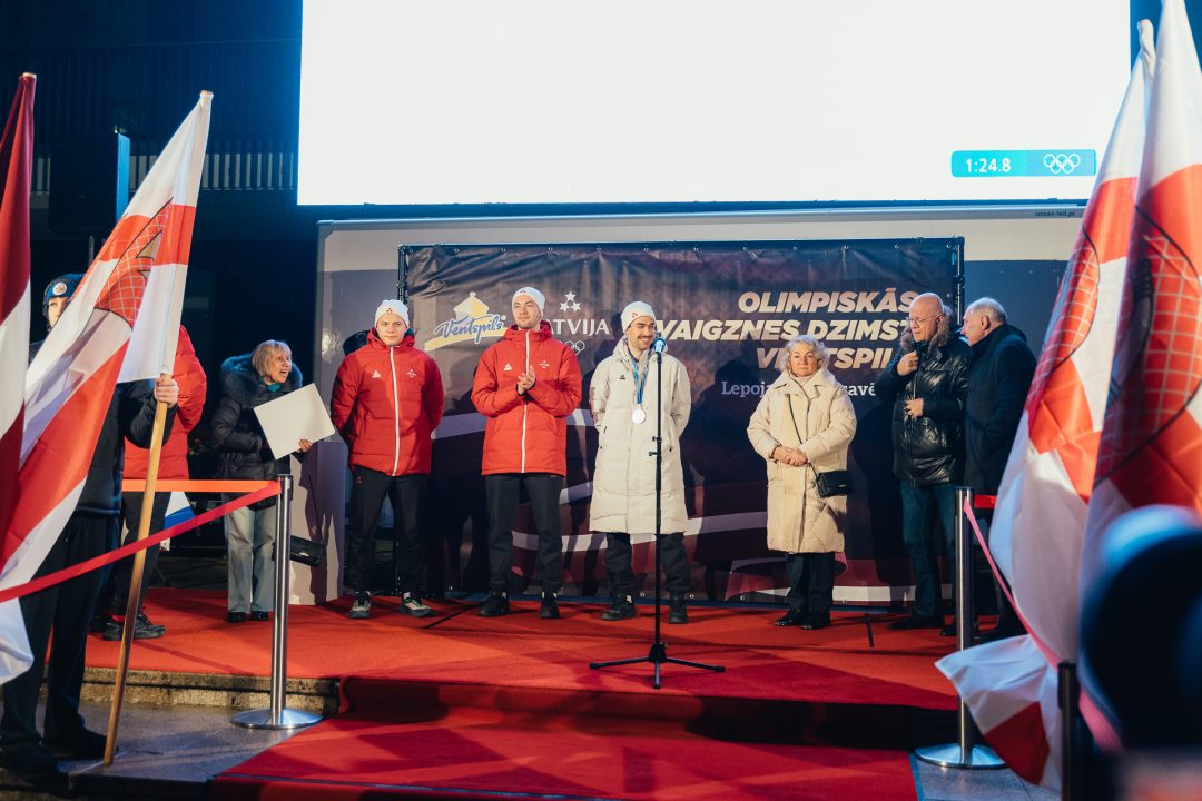 Otrdien, 24. februārī, plkst. 22.00 Ventspils Lielajā laukumā ar skaļām ovācijām un lielu lepnumu tika sagaidīti un godināti Milānas–Kortīnas XXV Ziemas olimpisko spēļu dalībnieki – šorttrekists un bronzas medaļas ieguvējs Roberts Krūzbergs, bobslejists Jēkabs Kalenda un šorttrek treneris Kārlis Krūzbergs. Pasākums pulcēja kuplu ventspilnieku pulku, sportistu ģimenes locekļus, sporta līdzjutējus, pašvaldības pārstāvjus un atbalstītājus, lai sveiktu olimpiešus pēc izcilā snieguma Milānā–Kortīnā.