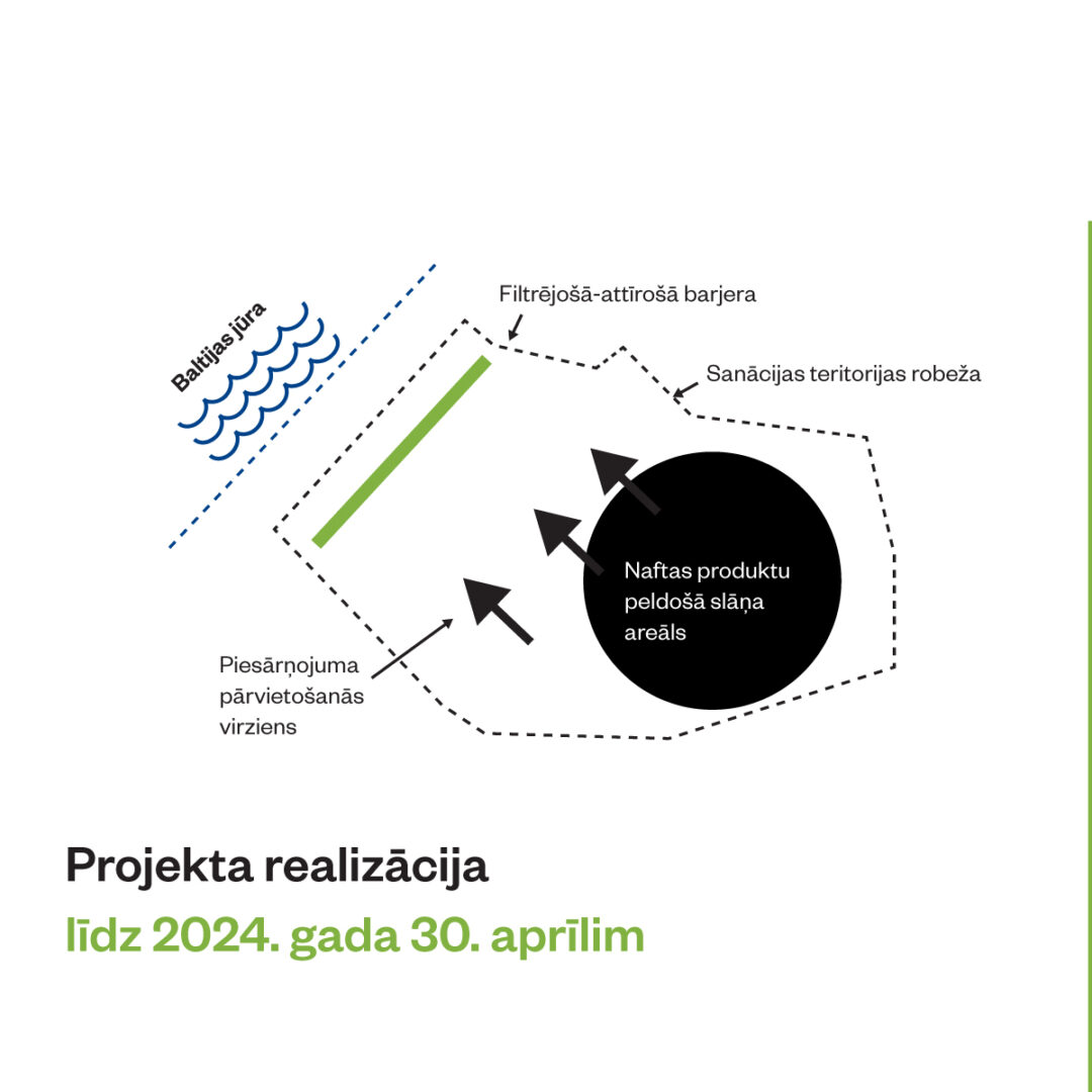 Pielietojot ilgtspējīgas attīrīšanas tehnoloģijas, tiks likvidēta piesārņotās teritorijas grunts masīvā esošo brīvo naftas produktu frakcija un paralēli Baltijas jūras krasta zonai vismazi 300 metru garumā piesārņotajā teritorijā tiks ierīkota filtrējošas – attīrošas barjeras sistēma, kas nodrošinās piesārņotā gruntsūdens migrācijas pārtraukšanu Baltijas jūras virzienā, pilnībā novēršot jūras akvatorijas piesārņojuma riskus. Papildus sanācijas darbiem tiks īstenota sabiedrības informēšanas kampaņa, paaugstinot sabiedrības izpratni par aktuāliem vides un klimata jautājumiem.