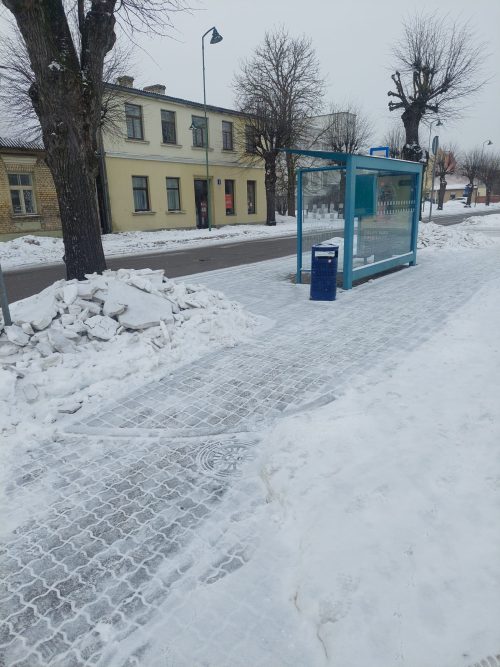 Lauku ielā pie autobusa pieturas, izkāpjot no autobusa, cilvēks nokļūst uz grumbuļotas, ar ledu klātas ietves, kas, šķiet, nav redzējusi ne tīrīšanu, ne kaisīšanu. Paiet normāli nav iespējams, cilvēki iet un krīt. Kam šī teritorija ir jākopj? Kāds no priekšniekiem varētu izkāpt no auto un pamēģināt te paiet.