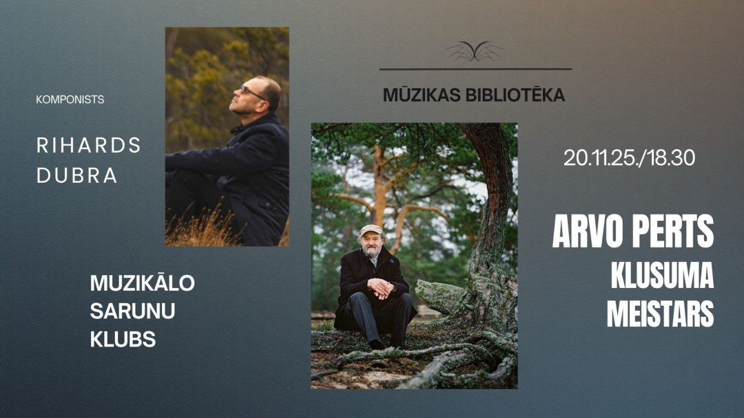 Ceturtdien, 20. novembrī, plkst. 18.30 Mūzikas bibliotēkā notiks muzikālo sarunu kluba tikšanās, kuras viesis būs komponists Rihards Dubra. Šīs reizes tēma  –  “Arvo Perts  – klusuma meistars”, veltīta izcilajam igauņu komponistam Arvo Pērtam, kurš šogad svin savu 90. dzimšanas dienu.