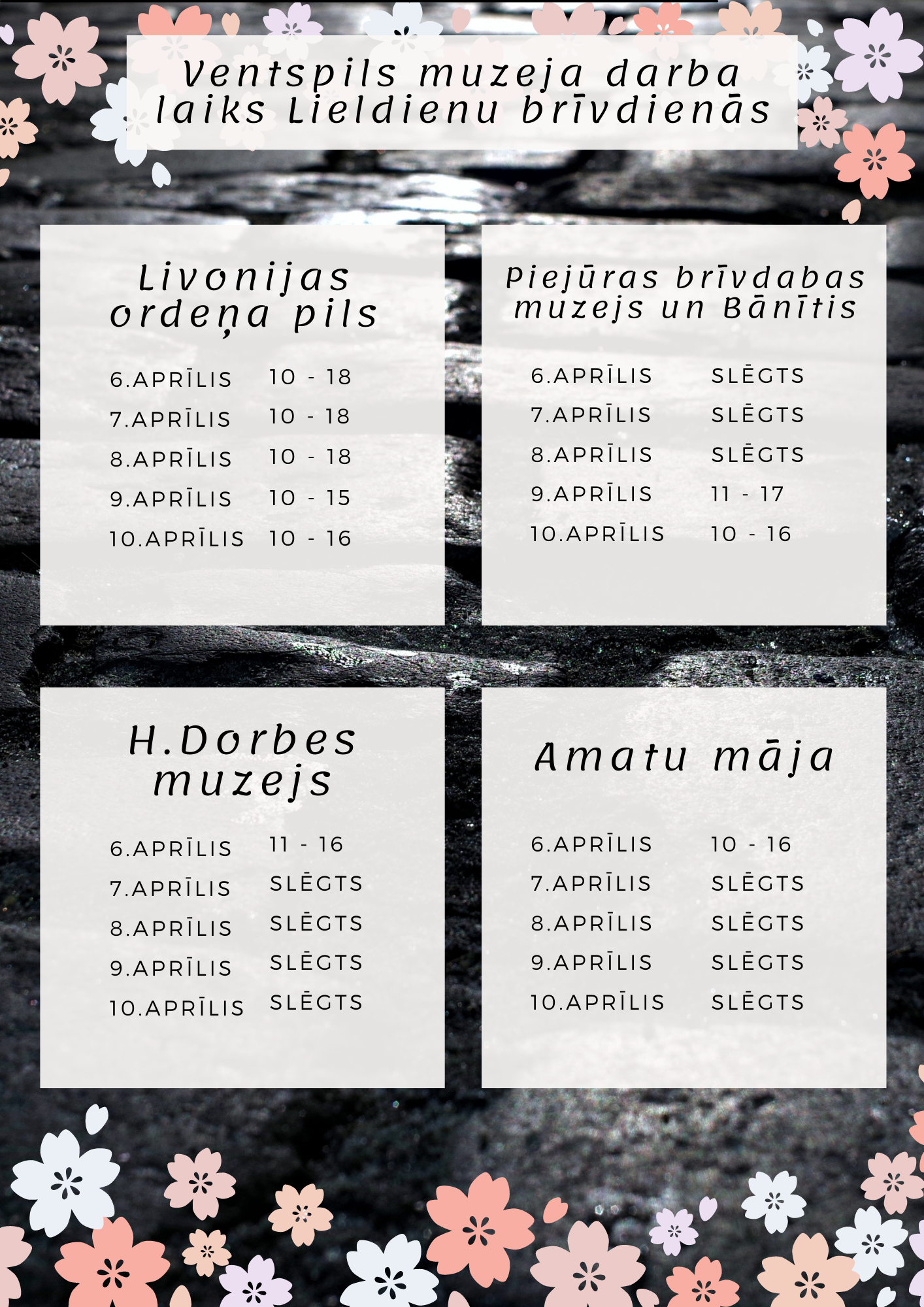 Ieeja ar muzeja ieejas biļetēm, biļetes var iegādāties arī vietnē mobilly. Muzejs 9. aprīlī atvērts no 11:00-17:00, bet 10. aprīlī no 10:00 – 16:00.