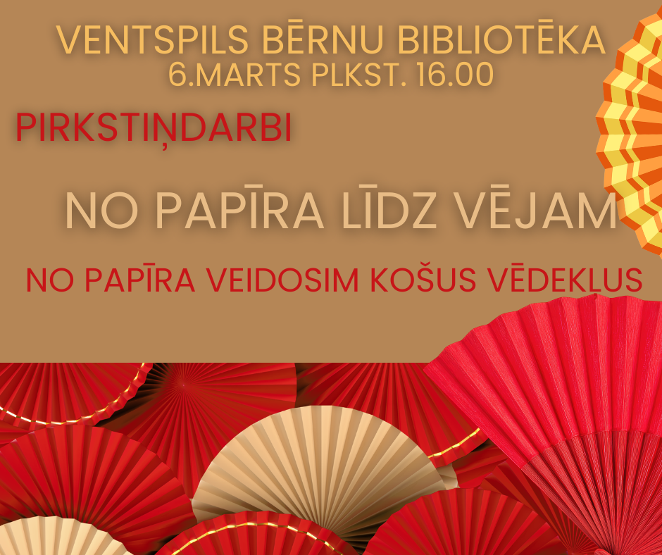 6. martā, plkst. 16.00 Bērnu bibliotēkā notiks pirkstiņdarbi “No papīra līdz vējam”. Šoreiz no papīra veidosim košus vēdekļus.