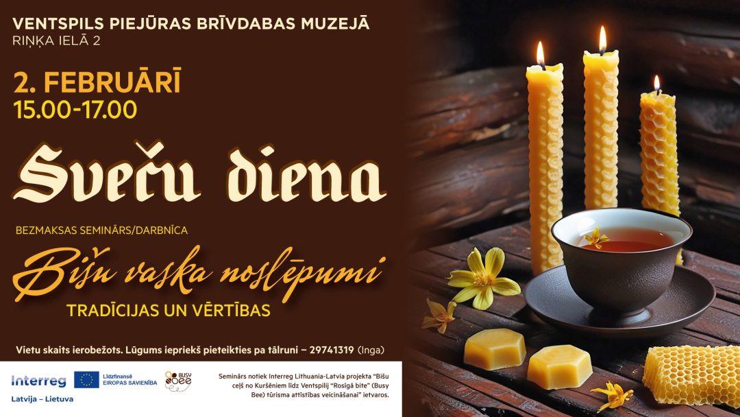 Piejūras brīvdabas muzejā svinēs Sveču dienu, kuras ietvaros norisināsies seminārs-darbnīca “Bišu vaska noslēpumi”. Pasākumu vadīs muzeja pedagoģe Inga Uhaņa un vēsturniece Dace Kamela – iepazīstinās dalībniekus ar Sveču dienas nozīmi latviešu tautas ticējumos un ikdienas dzīvē, kā arī atklās bišu vaska īpašo vietu tradicionālajā kultūrā.