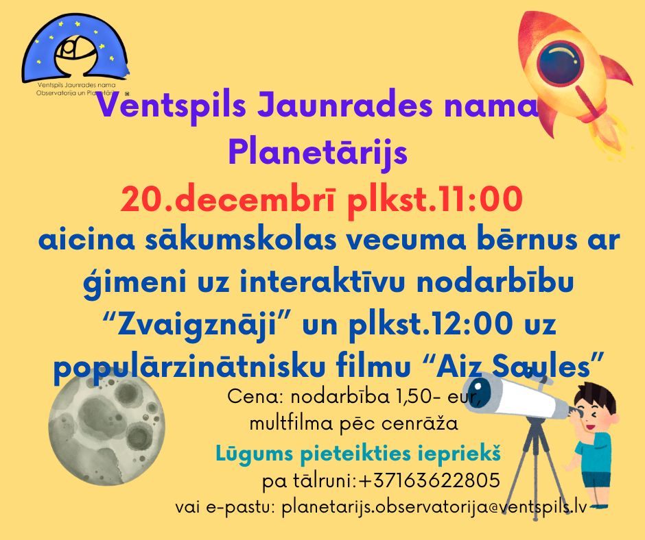 Planetārijs aicina 20. decembrī plkst. 12:00 sākumskolas vecuma bērnus kopā ar ģimeni uz interaktīvu nodarbību “Zvaigznāji”.