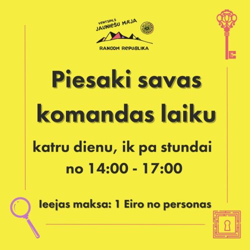 Piedalīties aicināts ikviens, komandai, līdz 4 cilvēkiem, būs dotas 60 minūtes, lai pildot dažādus āķīgus uzdevumus spētu atslēgt slēdzenes, uzminēt kodus un izkļūtu no istabas! Laiki, kuros var pieteikties 14:00, 15:00, 16:00 un 17:00.