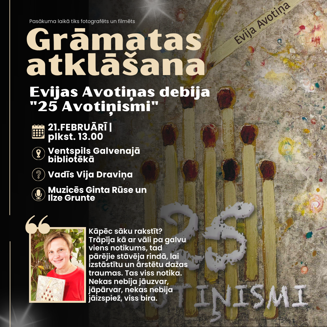februārī, plkst. 13.00 Evija Avotiņa aicina uz savas grāmatas “25 Avotiņismi” atklāšanu Ventspils Galvenajā bibliotēkā. Pasākuma laikā autore lasīs dzejoļus, baudīsim mākslinieka Viļņa Heinrihsona grāmatai radīto ilustrāciju izstādi, muzicēs Ginta Rūse un citi, kas vēlēsies. Pasākumu vadīs skolotāja, režisore Vija Draviņa. Ieeja pasākumā – bez maksas.
