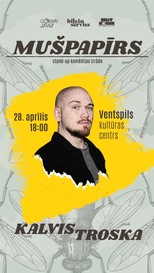 Biļetes uz stāvizrādi “Mušpapīrs” ir iespējams iegādāties comedylatvia.lv & bilesuserviss.lv