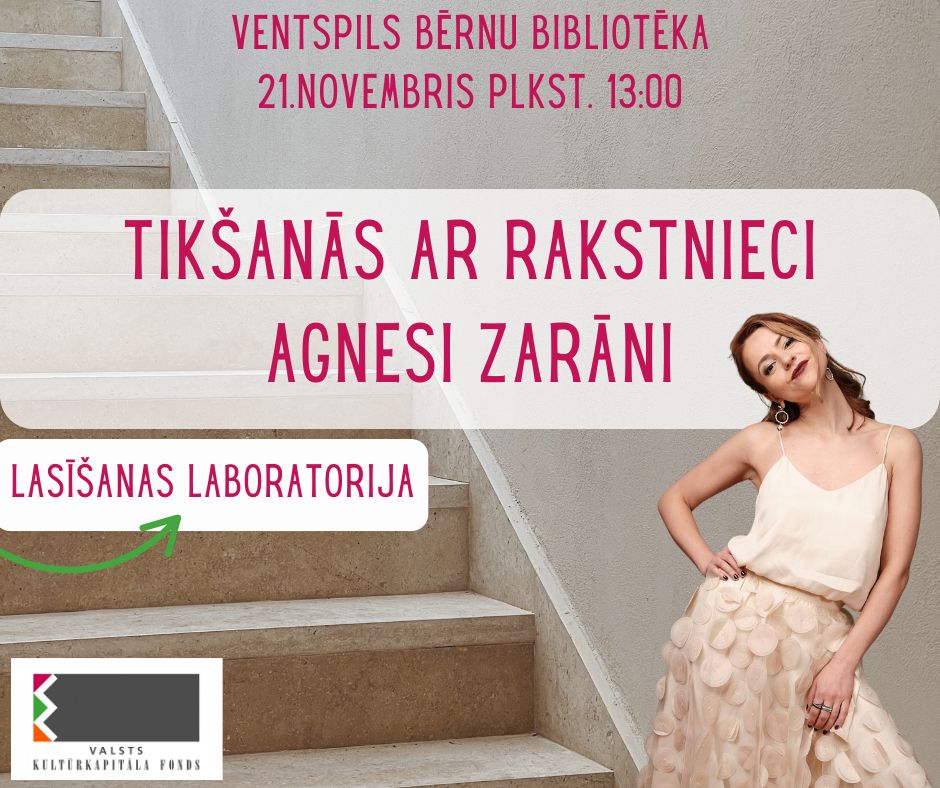 Piektdien, 21. novembrī, plkst. 13.00 Bērnu bibliotēkā ar lasītājiem tiksies rakstniece Agnese Zarāne. Viesošanās Ventspilī notiks ar Valsts kultūrkapitāla fonda finansiālu atbalstu projektā “Lasīšanas laboratorija”.