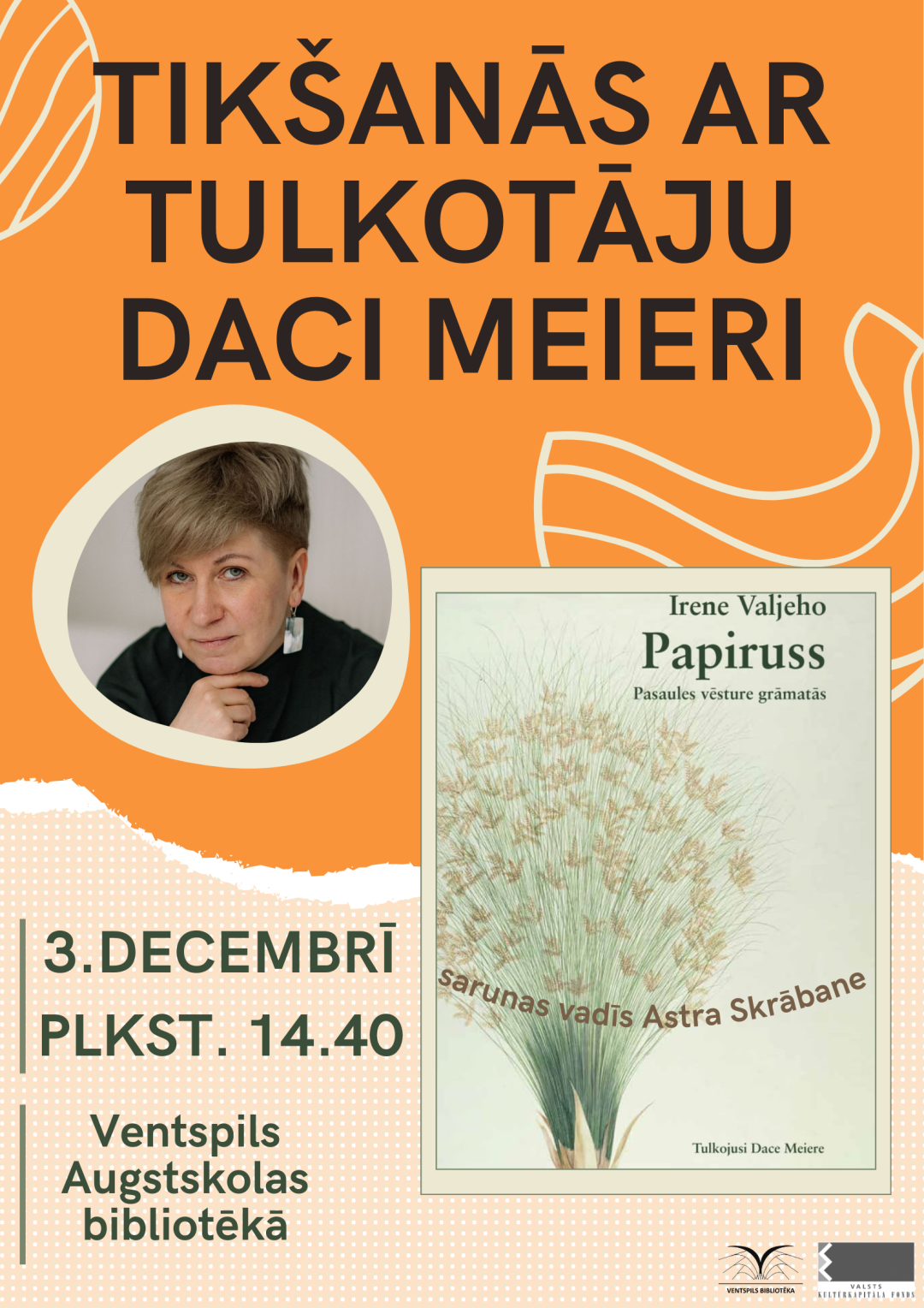 Trešdien, 3. decembrī, plkst. 14.00 Ventspils Augstskolas bibliotēkā viesosies tulkotāja Dace Meiere Valsts kultūrkapitāla fonda projekta “Grāmatu vēsture tulkojumā un sarunās” ietvaros. Pasākumā tiks runāts par Daces Meieres tulkoto Irenes Valjeho grāmatu “Papiruss. Pasaules vēsture grāmatās” un tulkojuma spēju veicināt motivāciju lasīt. Pasākumu un diskusiju vadīs Ventspils Augstskolas Tulkošanas studiju fakultātes vadošā pētniece Astra Skrābene.