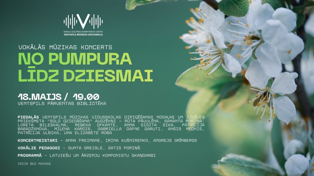 MIKC “Ventspils Mūzikas vidusskola” diriģēšanas nodaļas un izvēles priekšmeta “Solo dziedāšana” audzēkņi aicina uz vokālās mūzikas koncertu “No pumpura līdz dziesmai” 18. maijā plkst. 19.00 Pārventas bibliotēkā.