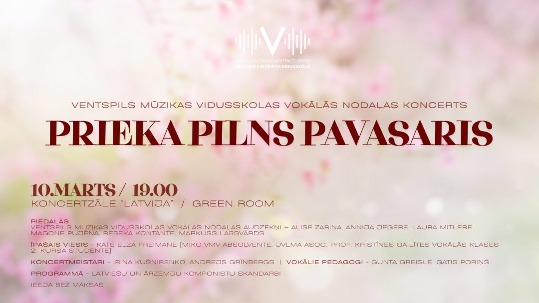 Aicinām uz Ventspils Mūzikas vidusskolas Vokālās nodaļas koncertu “Prieka pilns pavasaris” šī gada 10.martā plkst. 19.00 koncertzāles “Latvija” Green room (2.stāvā).