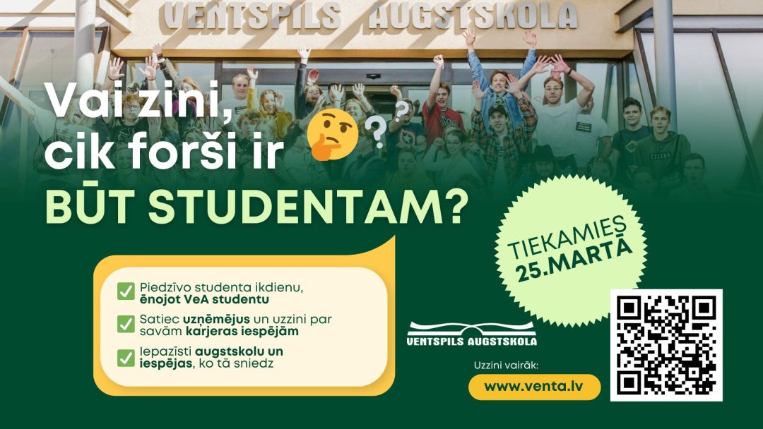 25. martā Ventspils Augstskolā norisināsies Karjeras diena 2026 – aizraujošs un iedvesmojošs pasākums, kas sniegs iespēju gan esošajiem, gan topošajiem studentiem iepazīties ar darba tirgus iespējām, satikt uzņēmējus, uzzināt par dažādu nozaru prasībām un karjeras attīstības ceļiem.