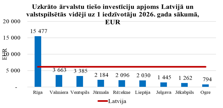 Ārvalstu tiešās investīcijas Latvijā un valstspilsētās uz 1 iedzīvotāju 2026. gada sākumā, EUR