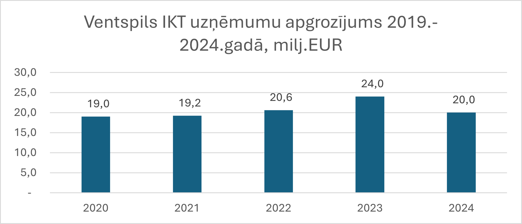 Kopējais Ventspils IKT uzņēmumu apgrozījums 2024.gadā sasniedza 20 milj. EUR, kas ir par 5% vairāk nekā 2020.gadā. Apgrozījuma pieaugums liecina par nozares dzīvotspēju un spēju piesaistīt jaunus projektus un klientus.