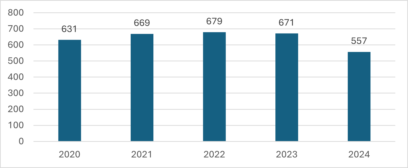 Darbinieku skaits Ventspils IKT uzņēmumos 2020.-2024.gadā, cilv.