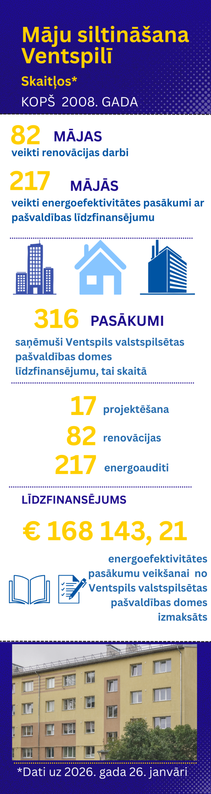 Kopš 2008. gada jūnija Ventspils daudzdzīvokļu dzīvojamo māju apsaimniekotājiem ir pieejams pilsētas pašvaldības līdzfinansējums energoefektivitātes pasākumu veikšanai – dzīvojamo māju energoauditam, māju renovācijai un tehniskā projekta izstrādei. Tādējādi Ventspils pilsētas dome rūpējas par pilsētnieku iespējām dzīvot sakārtotā vidē un ietaupīt, samazinot patērētās siltumenerģijas daudzumu un maksu par to. Ēku siltināšana ļauj būt saudzīgākiem pret apkārtējo vidi, mazāk patērējot neatjaunojamos dabas resursus.