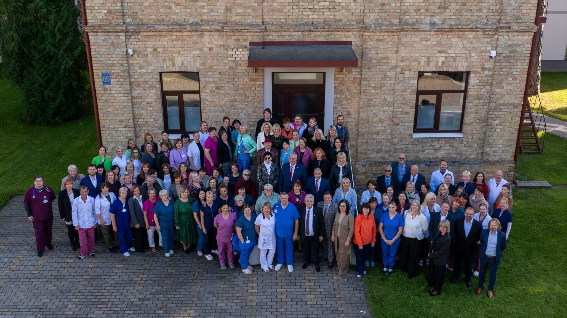 Foto: Ziemeļkurzemes reģionālās slimnīcas darbinieki, Veselības ministrijas Veselības aprūpes departamenta direktore Sanita Janka, slimnīcas padomes loceklis Igors Udodovs, slimnīcas īpašnieka – Ventspils valstspilsētas pašvaldības domes – pārstāvji, kā arī eksperti no Somijas uzņēmuma NHG Finland Oy. Kopfoto tapis pirms Ventspils slimnīcas simtgadei veltītās svinīgās sēdēs, 2025. gada 3. oktobrī plkst. 14.10.